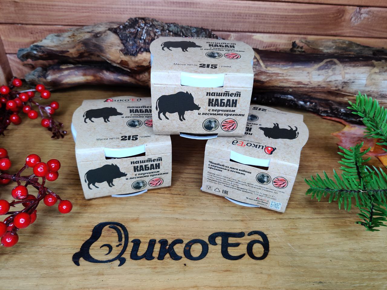 Паштет из мяса кабана с перчиком и лесными орехами – лёгкий и приятный продукт без химических добавок и консервантов. Вкус дичи за время переработки он практически теряет. Намазывая его на хлеб, понимаешь, что это не тушёнка, а именно доведённый до пастообразного состояния паштет. Кроме экологически чистого мяса из сердца тайги, присутствуют добавки и приправы: паприка, лук, чеснок, перец чили. Для сочности добавлено сало. Фундук – кладезь полезных витаминов, микроэлементов, полиненасыщенных кислот –добавляет мясу сладковатую ноту и насыщенный вкус.