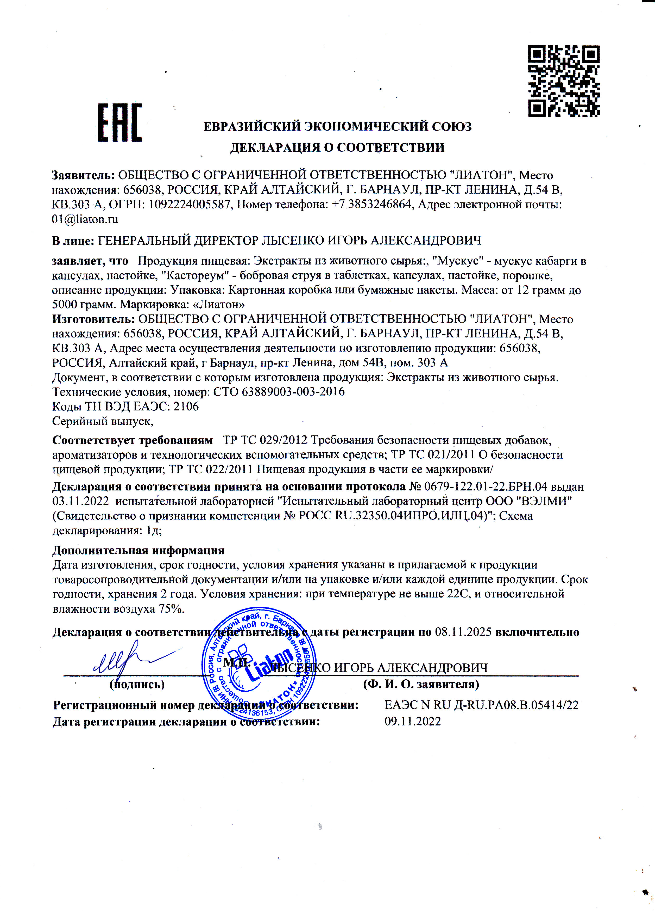 Декларации и Сертификаты: ЕАЭС N RU Д-RU.РА08.В.05414/22, срок действия до 08.11.2025